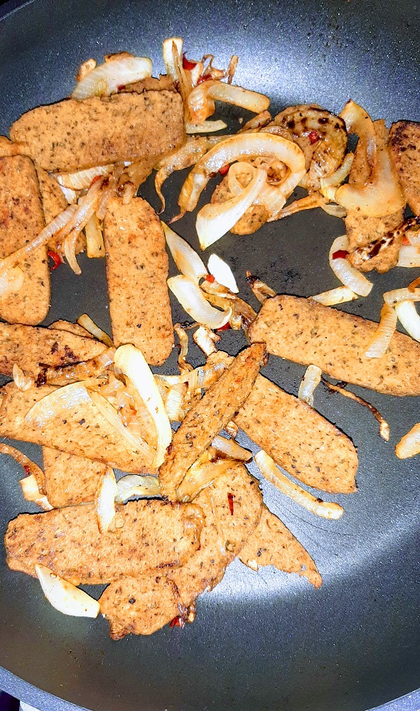Get the recipe I used to make this style of seitan, here. It’s pretty simple but it does have to simmer for about 40 to 45 minutes, so you should make it ahead of time.