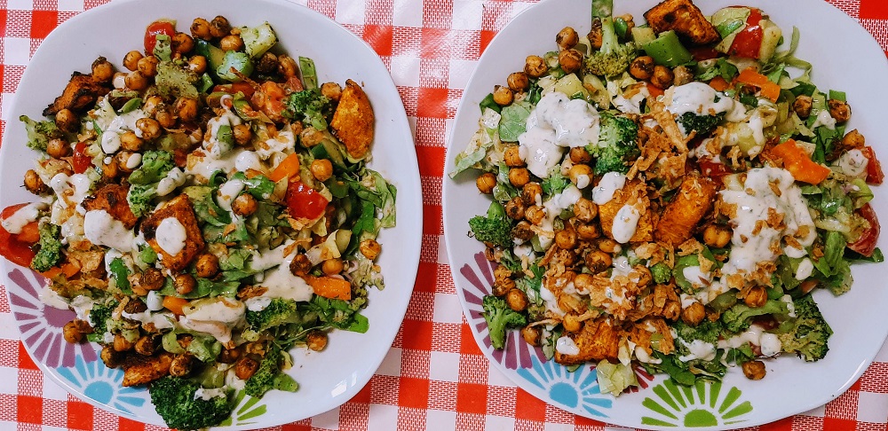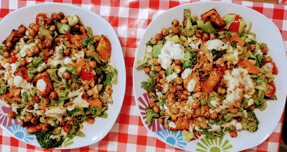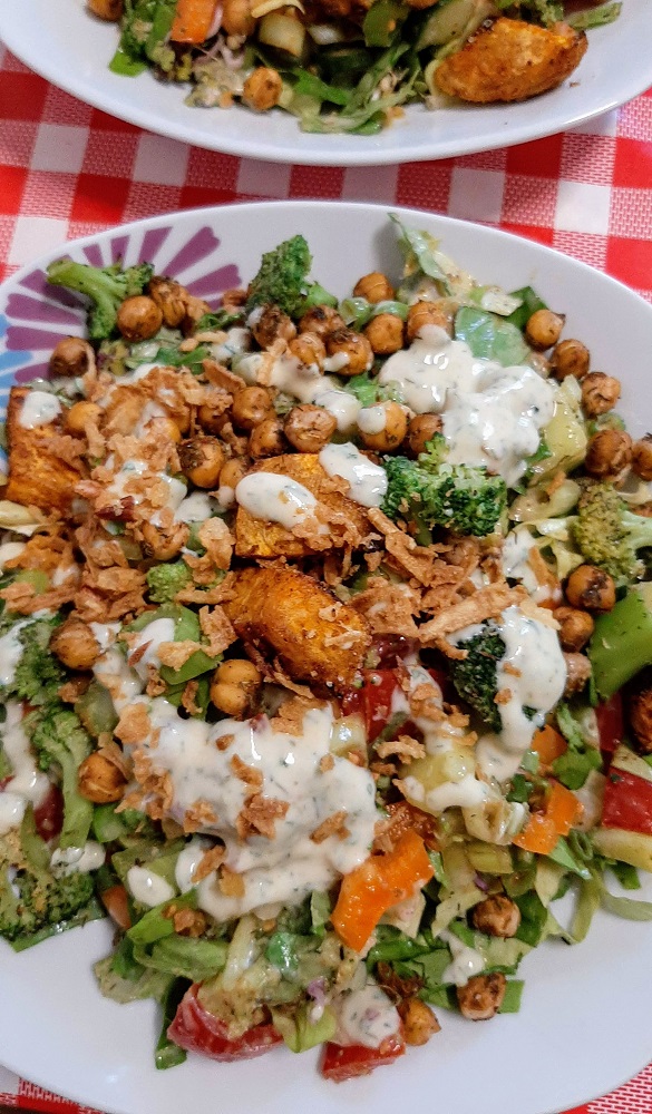 I tossed the salad in veggiegurt and used the left overs to make it visible for photos, so that last step isn’t necessary unless you plan to share beautiful vegan salad photos.