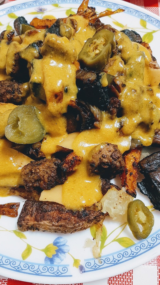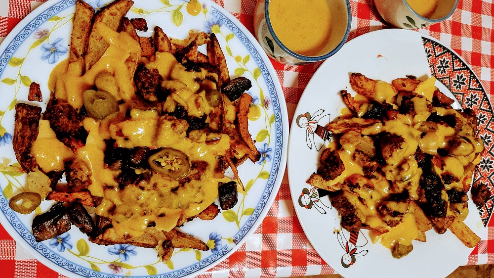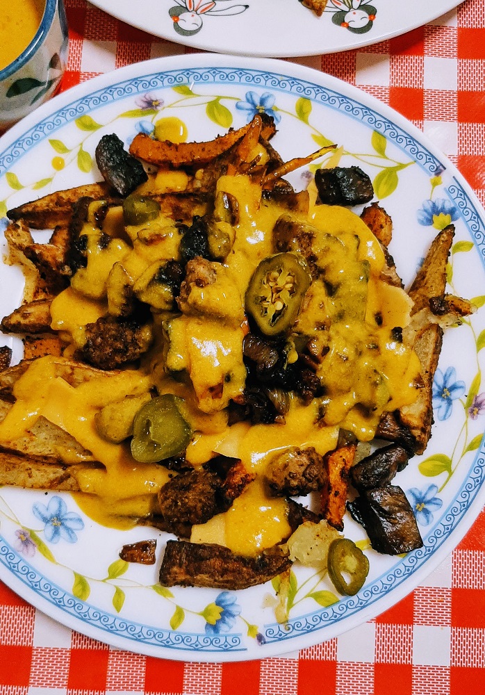 And what is greasier and more comforting than cheese fries? Vegan cheese fries with sausage, of course!