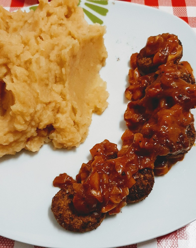 Easy. Vegan falafel balls with a delicious barbecue sauce and one of my favorites…vegan garlic mashed potatoes!