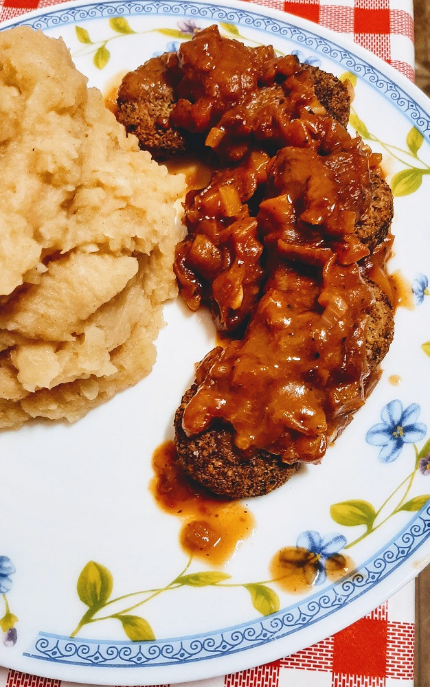 For the mashed potatoes: Boil the potatoes until tender, about 10 to 12 minutes. Drain and reserve some of the water. In the same pot you boiled the potatoes, add minced (or pressed) garlic to the hot pot and let it get nice and brown, but don’t burn it. I added water or almond milk by the teaspoon to keep the garlic from sticking, but any kind of fat will work too. Once the garlic is cooked, add milk and seasoning (basil, salt, pepper, garlic powder and turmeric) over low heat and let it cook a minute or two before you add the potatoes.