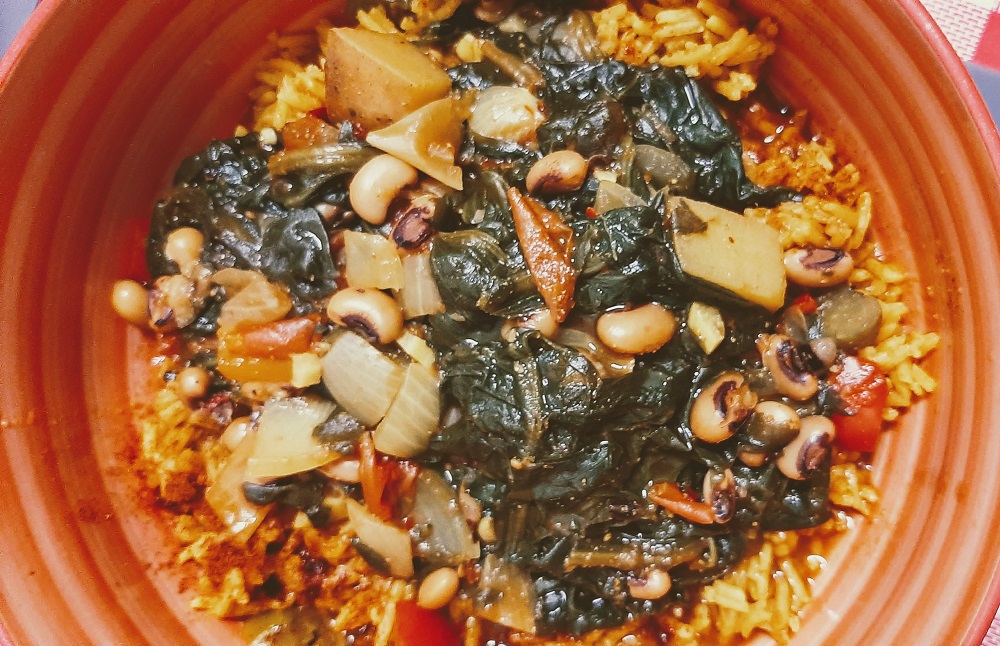 Add the beans, tomato paste and half the water. The amount of water you use will vary depending on how soupy you want the stew to be, so keep that in mind. Add half the beans, herbs & spices, and a bay leaf. Bring the mixture to a boil and then simmer for 10 minutes, and give it another taste. If you are satisfied with the flavor, add the rest of the water, beans, and the spinach.