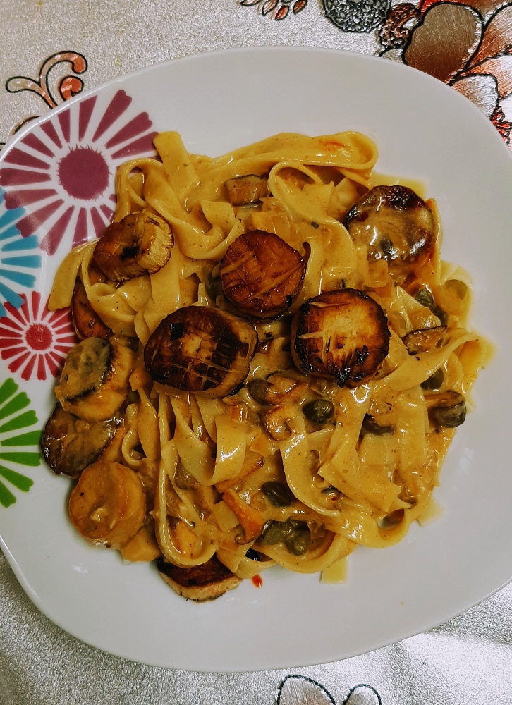 Step Eight: Add pasta and vegan scallops to the sauce, toss and then serve.