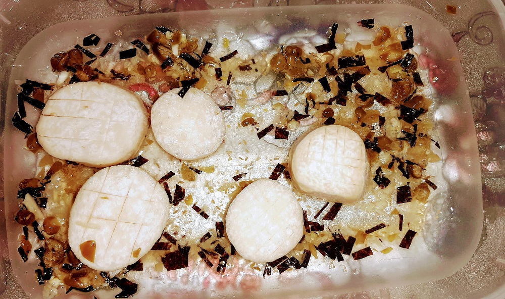 There are two schools of thought–apparently–when it comes to making these vegan scallops. Some have advised slicing the mushrooms and marinating them overnight while others say that thirty minutes or more will suffice.