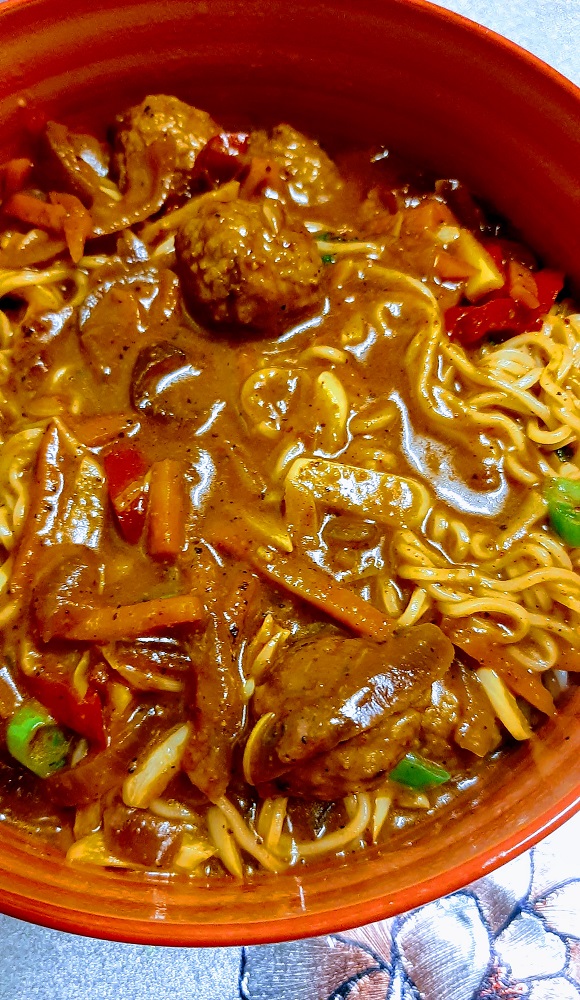 Add ramen noodles to the bowl, along with any kind of garnishes you choose, such as; basil, mint, bean sprouts, jalapenos or other spicy peppers, fresh scallions and/or rice vinegar.