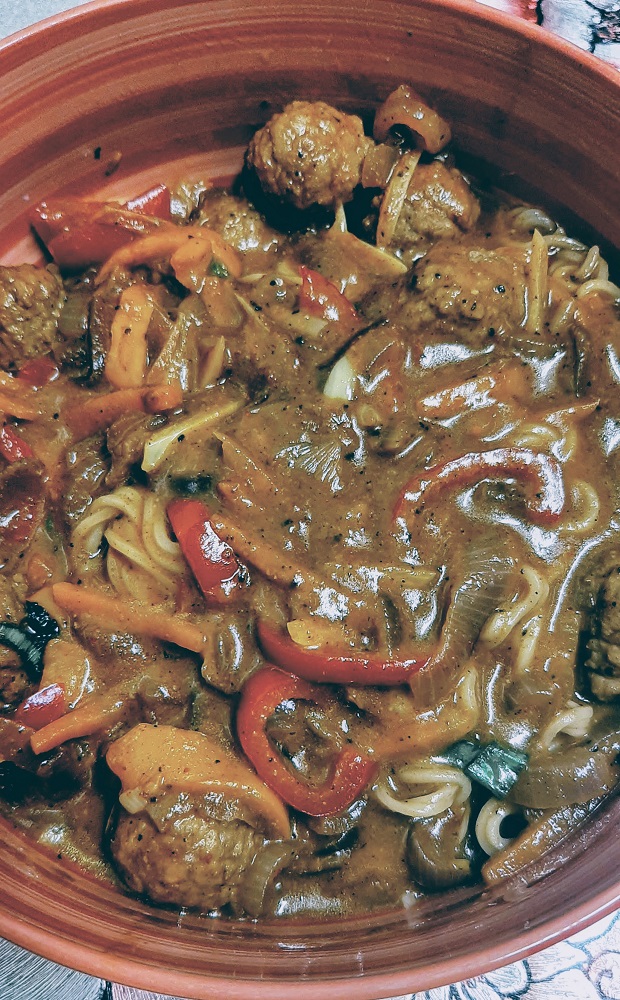 Back to the curry. When the vegetables are close to tender, add garlic and cook 2 to 3 more minutes. Pour in some broth and coconut milk, bring to a boil and then simmer. About 5 minutes before you’re ready to serve, toss the vegan meatballs into the mix.