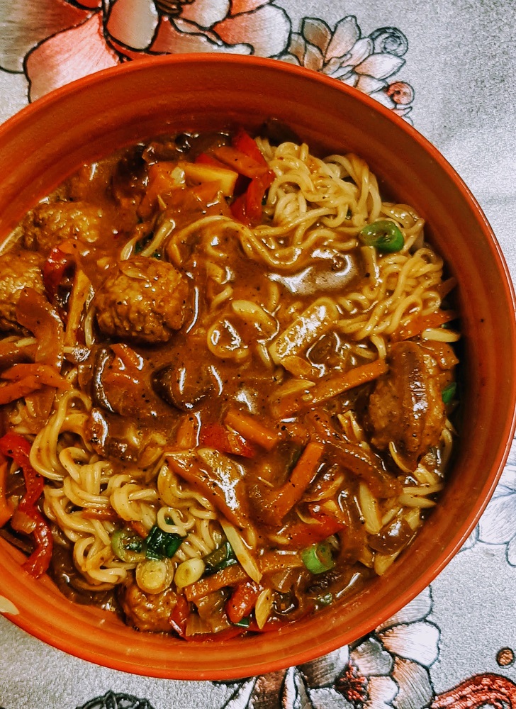 Add ramen noodles to the bowl, along with any kind of garnishes you choose, such as; basil, mint, bean sprouts, jalapenos or other spicy peppers, fresh scallions and/or rice vinegar.