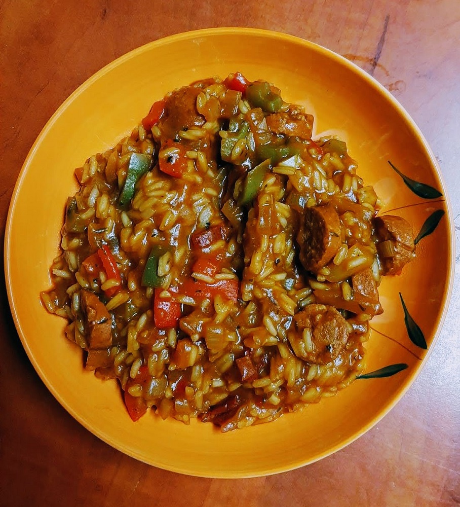 Jambalaya ingredients: Vegan sausage (I used Naturli), onion, bell peppers, garlic, sundried tomatoes, fresh tomato, jalapeno peppers (fresh or jarred), basmati rice, vegan Worcestershire sauce, tomato paste and water or broth.