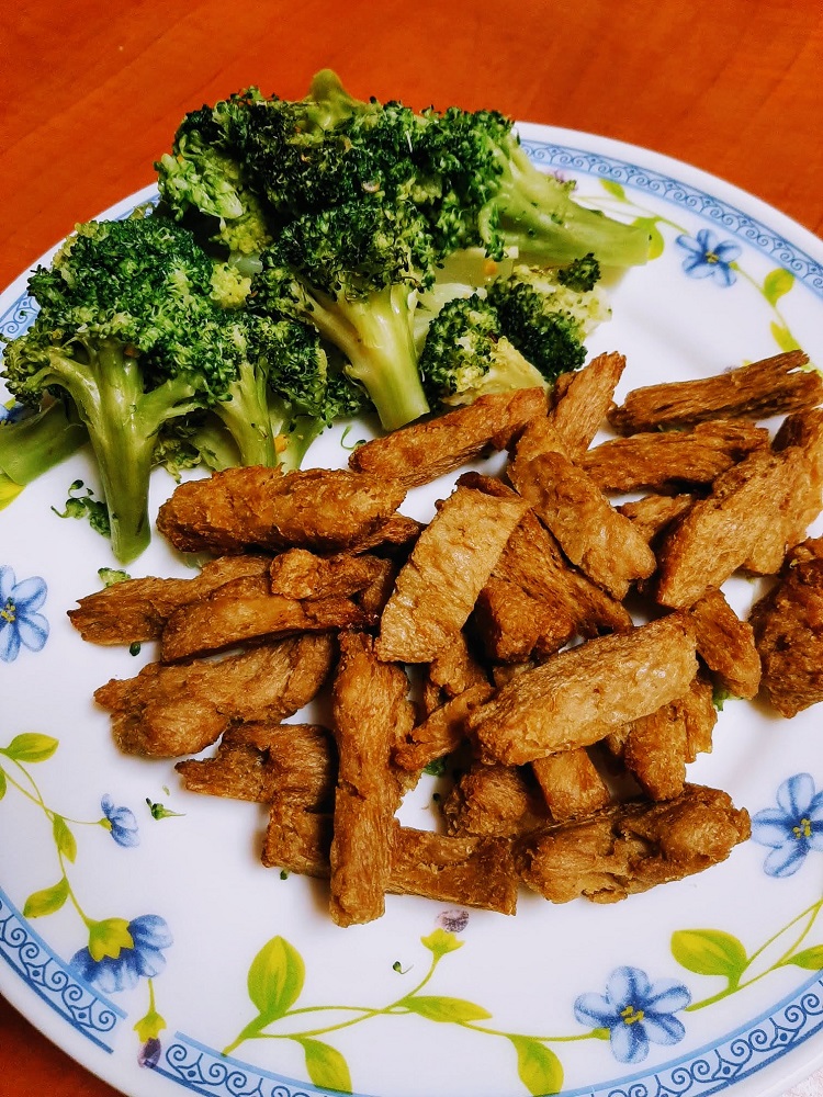 This vegan chicken is actually TVP so weigh it and add broth or water and put it on to boil while you chop up the broccoli. Then you can put it in the air fryer or cook it on high in the oven. If you’re up for a little more work, sauté it on top of the stove. I steamed the broccoli and then tossed with with salt, garlic granules and lemon zest and finished it off in the oven.