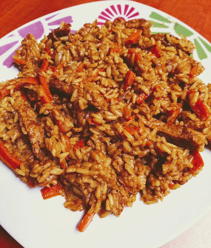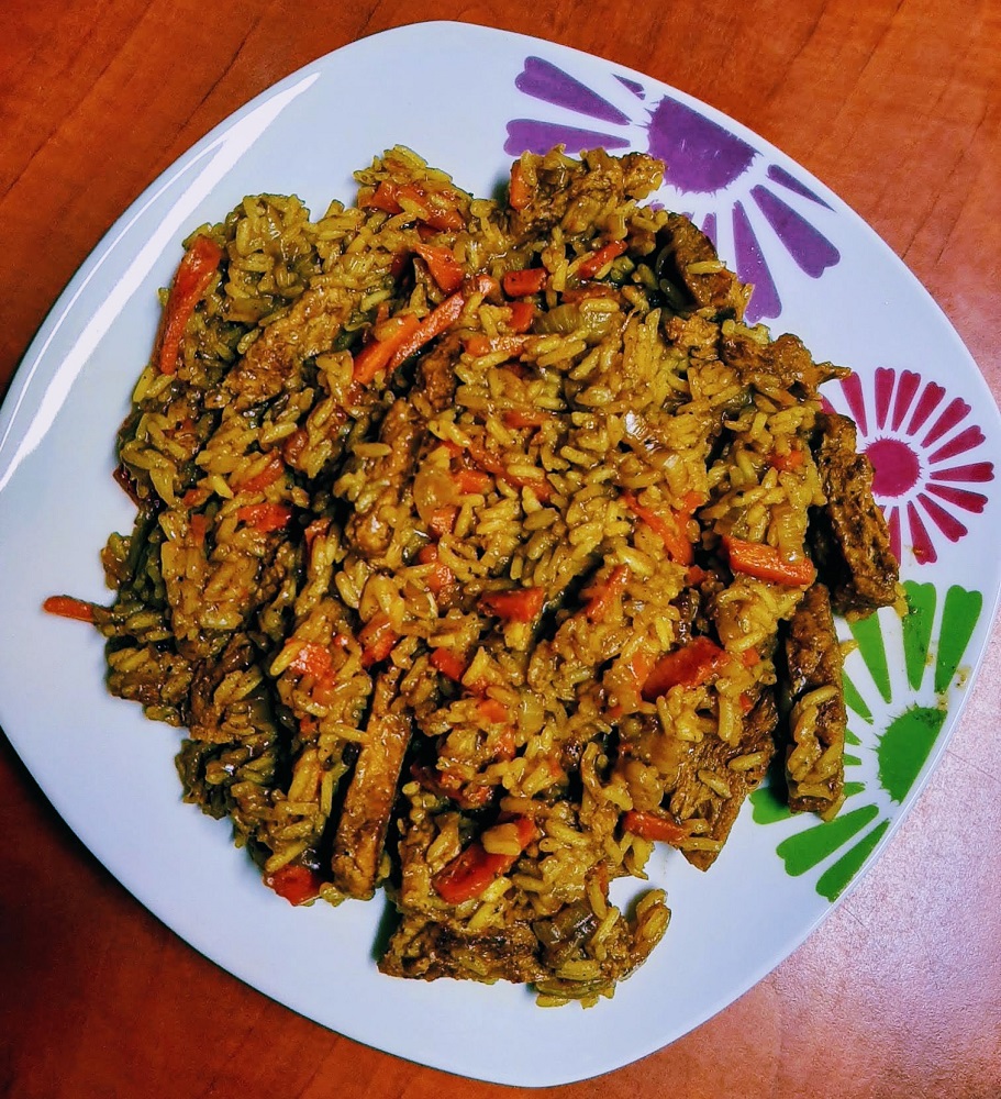 After you have rehydrated and drained the TVP, add it to whatever butter/oil is left in the skillet and cook it for about 5 to 7 minutes, until it starts to brown around the edges. Add the onion and carrots to the TVP and then the rice. Toss until coated completely and cook for another few minutes until everything is piping hot, or warm if that’s how you like to eat your meals.