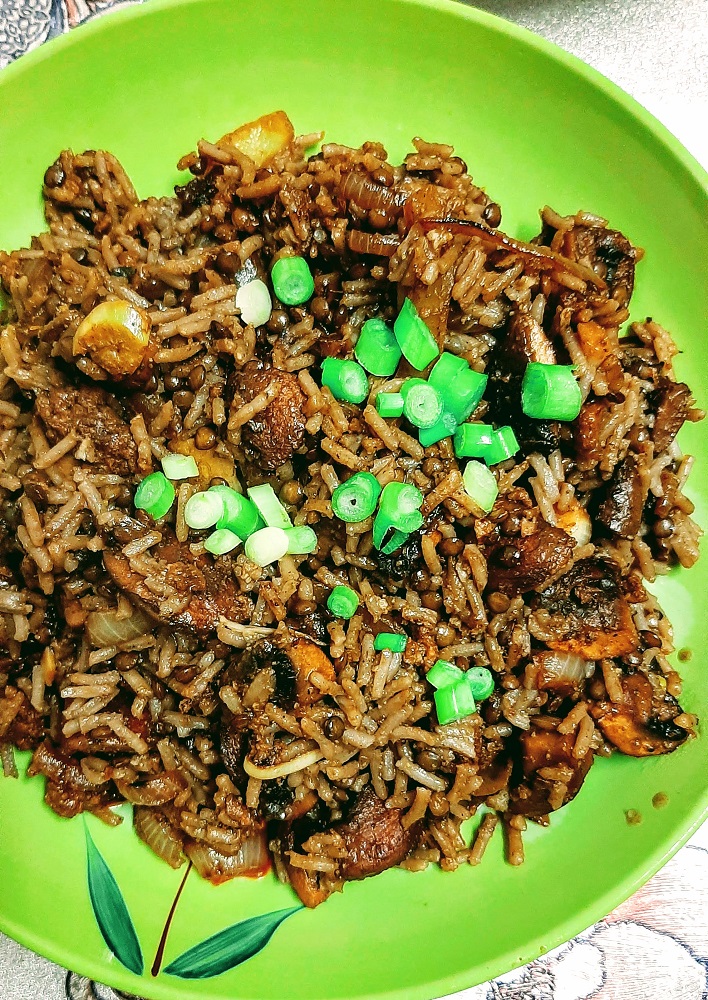 Most of the ingredients in this vegan mujadara are pantry staples like rice (or bulgur), onions & garlic, and lentils, not to mention fridge staples (for me) such as soy sauce and mushrooms. Add in anything else you want such as vegan mince, tofu or tempeh, and you’ve got your mujadara recipe complete.