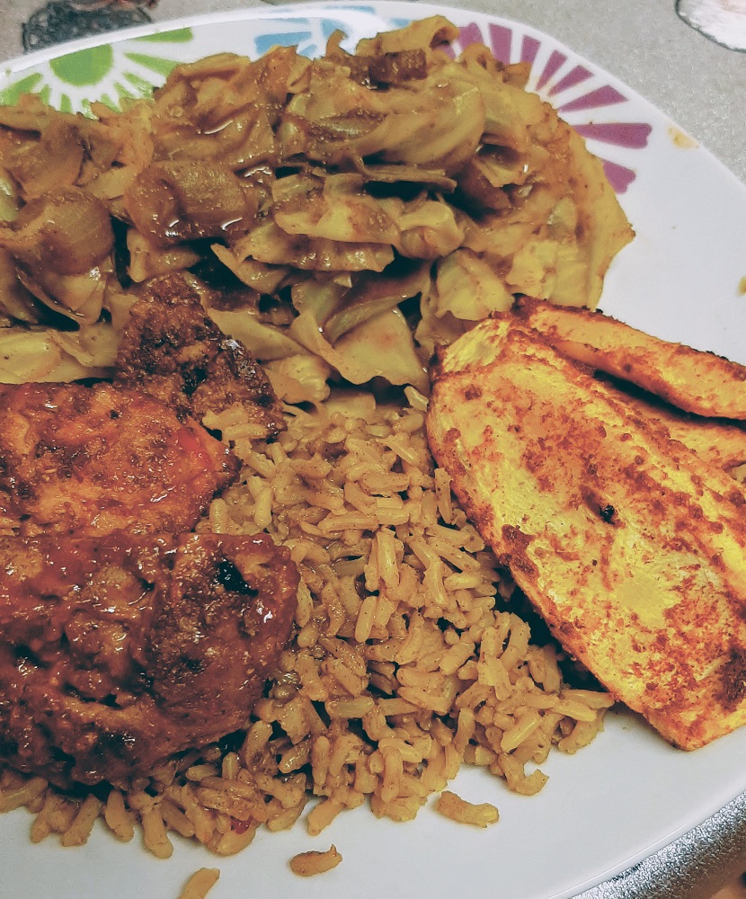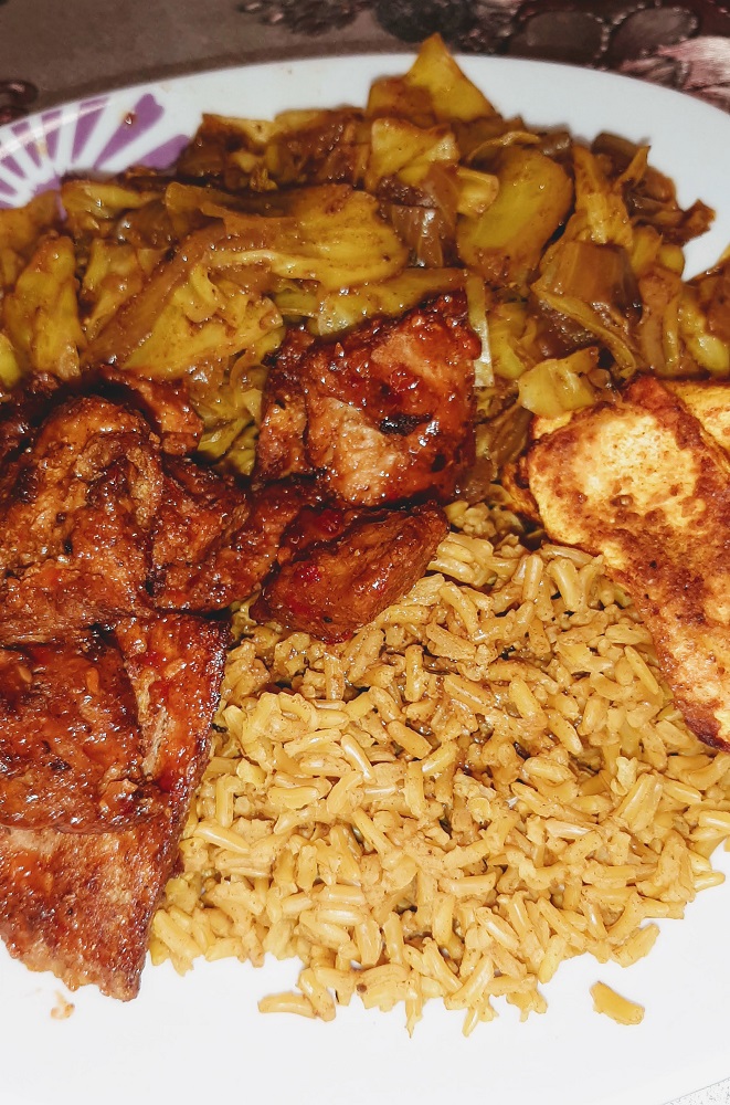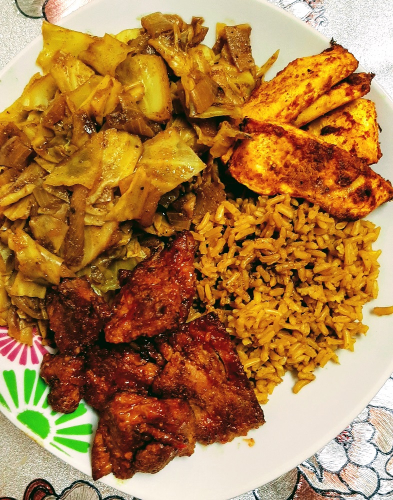 Cut the onion, garlic and cabbage, sauté with water, broth or soy sauce. Add to a skillet on medium-high heat and sauté until all of your cabbage is soft & tender. Stir frequently. Season with salt, pepper, garlic powder, cumin, ginger, yellow curry and scotch bonnet powder.