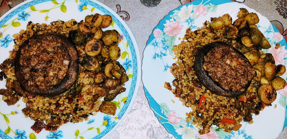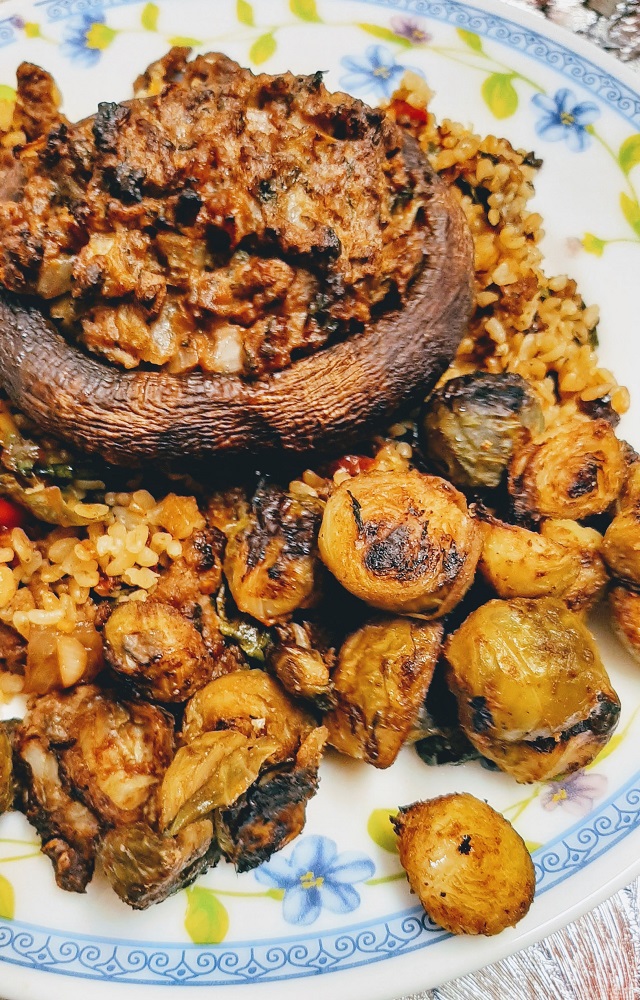 So, let’s talk about these Beyond Burger stuffed mushrooms with bulgur and Brussels sprouts.