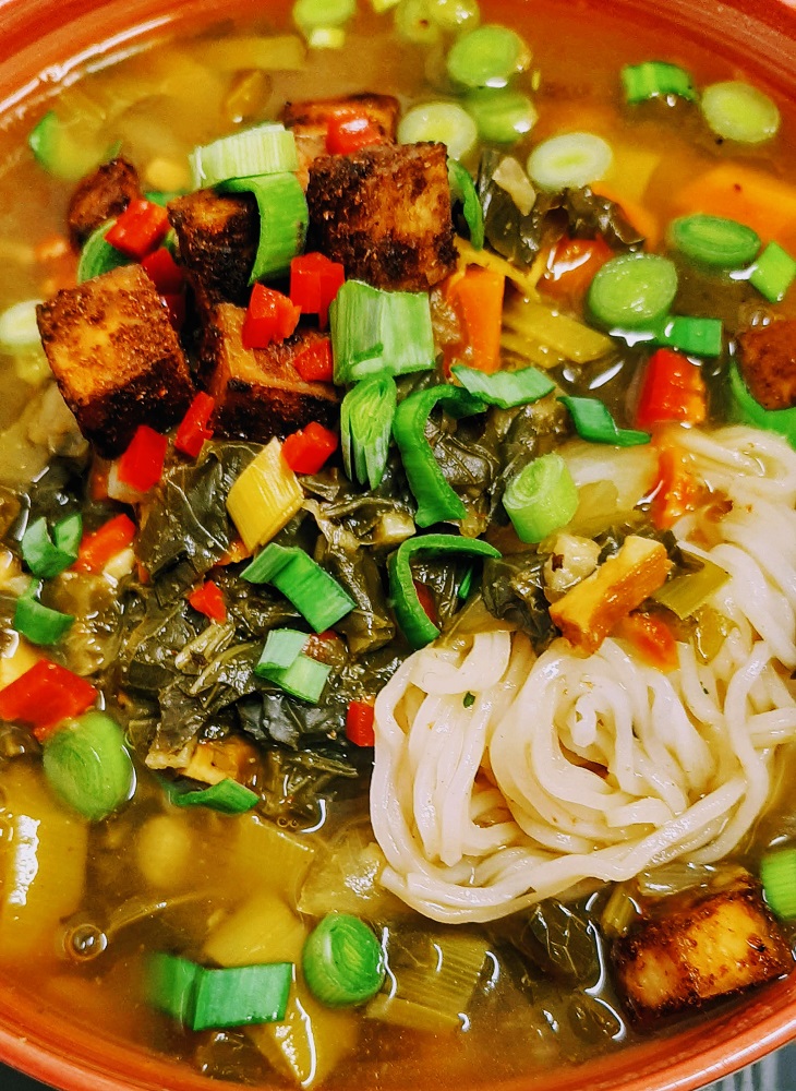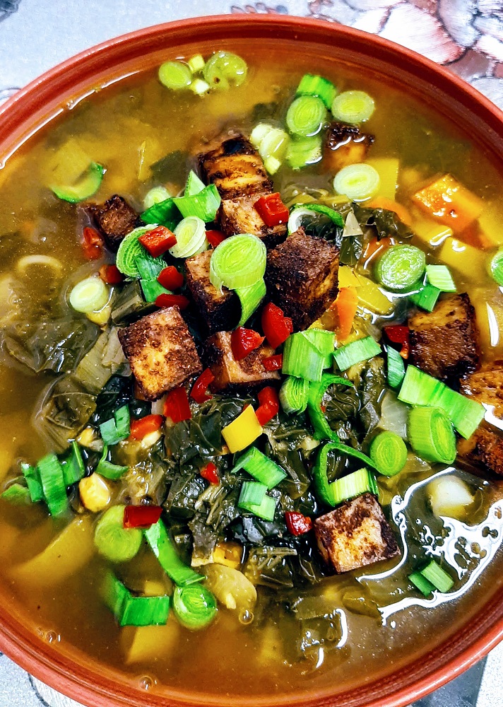 Before you get started on the soup, season the smoked tofu and pop it in the oven so you can enjoy a crispy texture with the soft-ness of your soup ingredients. It should take 15 to 20 minutes, depending on what you use. I used basic dry herbs with a bit of soy sauce and I started the tofu on 200C and reduced it to 180 when it started to sizzle.