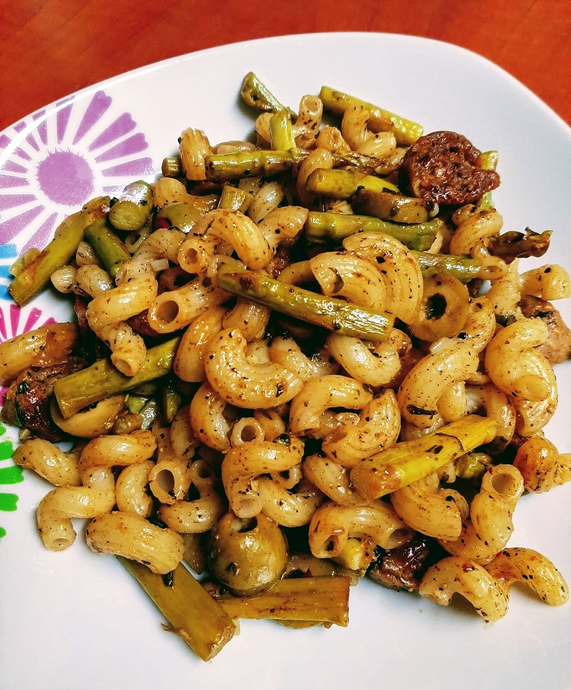 Since this is technically an oil free vegan recipe, you should start cooking the sausage first. Slice it beforehand so you get crispy edges with every single bite. Whatever fat is in the vegan sausage will render out and when it does, toss in the asparagus and garlic, stir until fragrant and cooked, about 5 minutes.