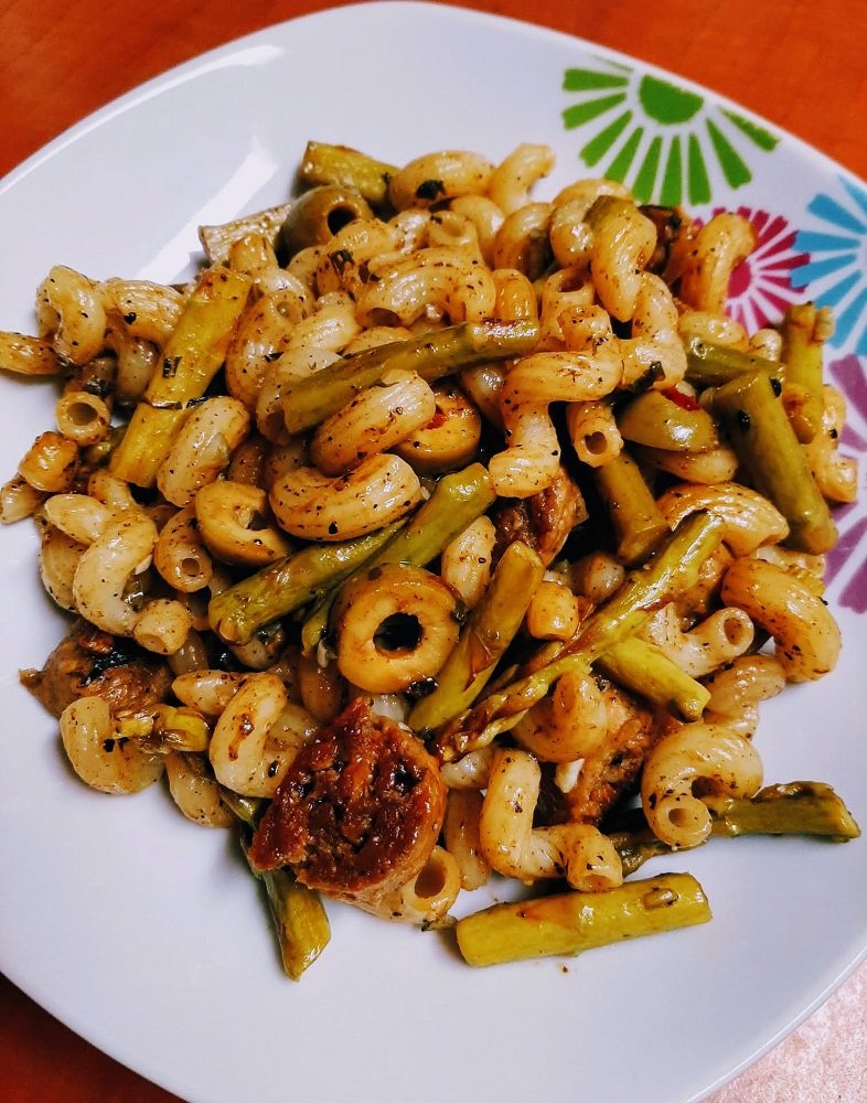 Since this is technically an oil free vegan recipe, you should start cooking the sausage first. Slice it beforehand so you get crispy edges with every single bite. Whatever fat is in the vegan sausage will render out and when it does, toss in the asparagus and garlic, stir until fragrant and cooked, about 5 minutes.