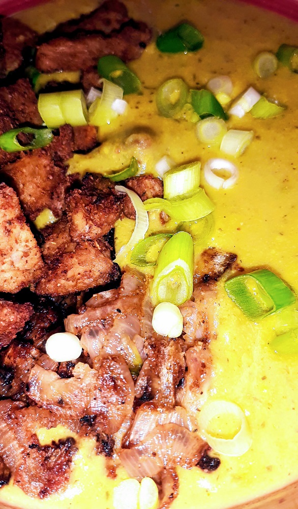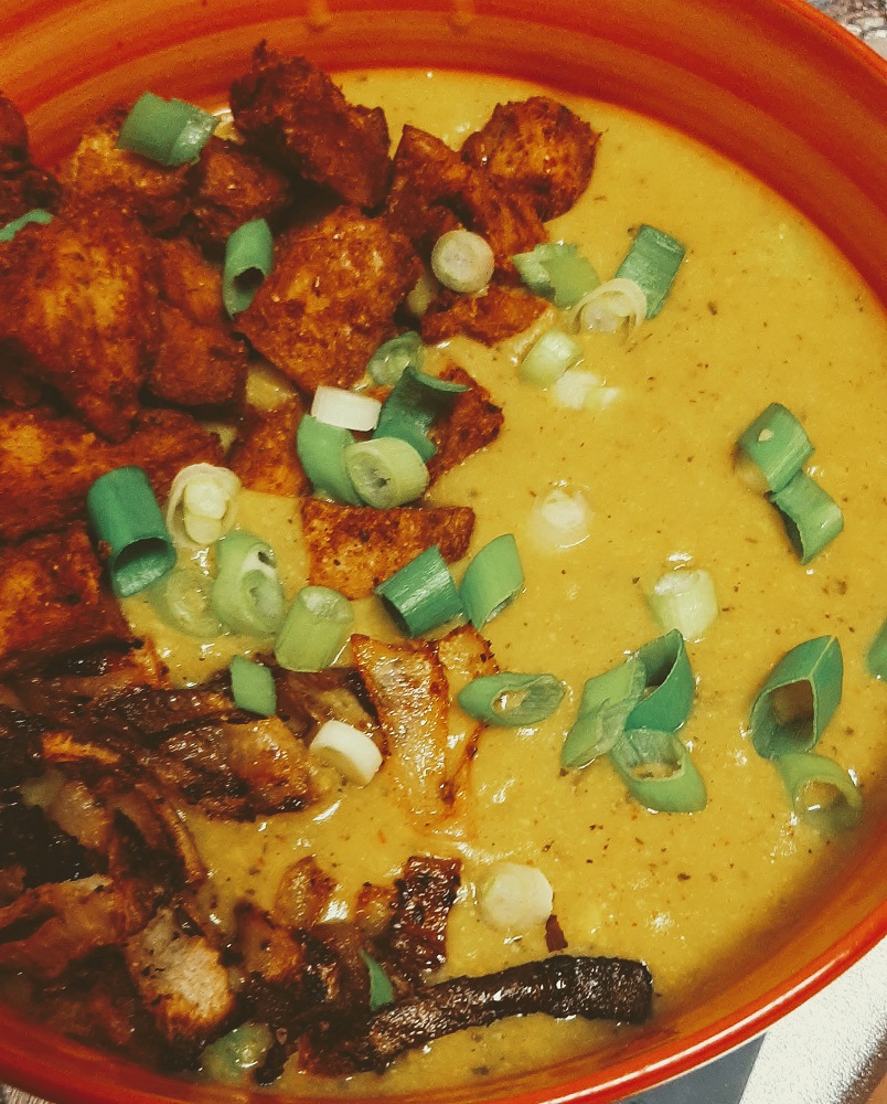 While the potato chowder is simmering and the flavors are blending, season and cook the TVP however you choose. For this recipe, I wanted it crispy almost like vegan chicken croutons to go alongside the roasted onions, so I used my handy air fryer. 200C for 13 minutes and they came out perfectly.