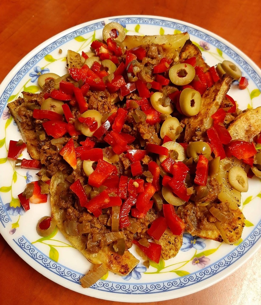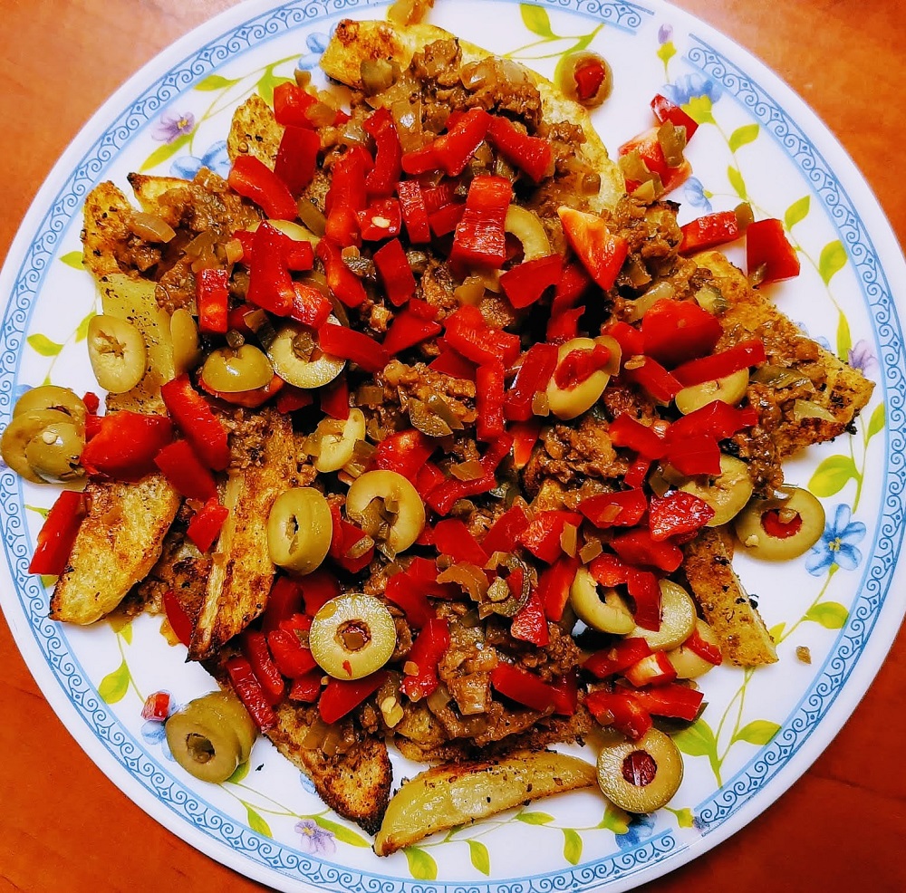 Plate it up however you want, of course, but start with the fries. I recommend fries and then vegan meat & vegetable mixture, then the toppings, saving the vegan tzatziki for last or maybe the sliced olives.