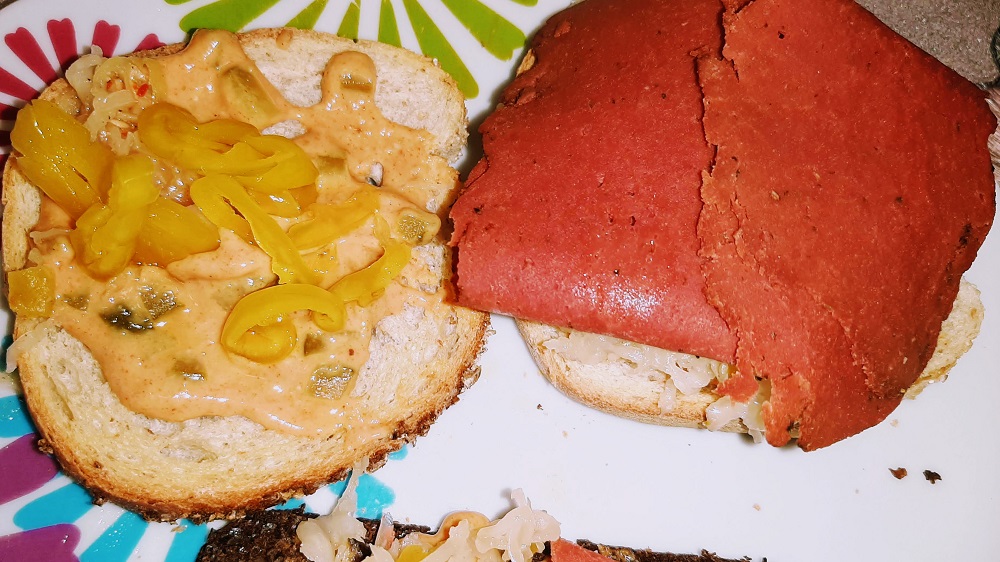 I have to say that the Filgud vegan pastrami did not disappoint. It had the exact right flavor profile and my only complaint, if you can call it that, was that the strips were a little too thin. I ended up tearing a few strips which made for less pretty photo.