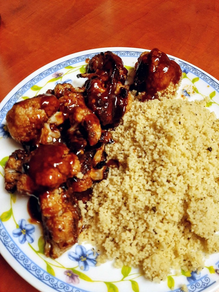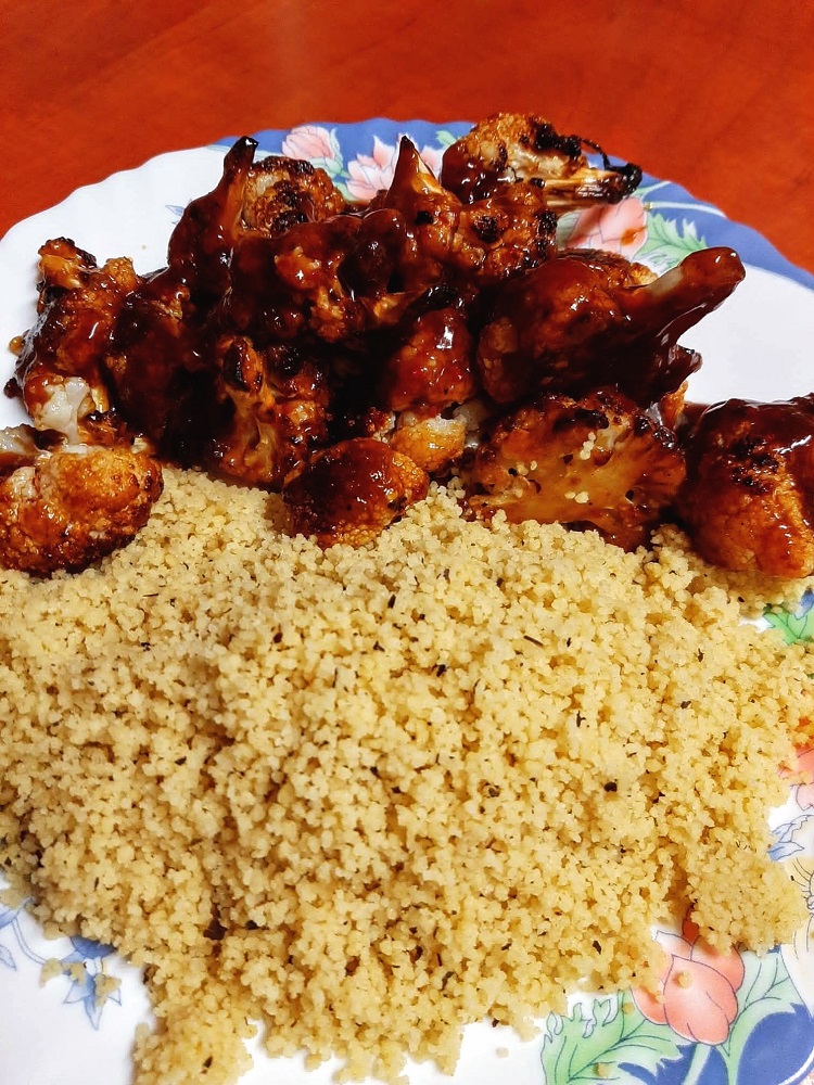 Plate up the couscous and cauliflower however you like. I’m more of a put it on a bed of grains kind of girl, while my Hubs likes to keep’em separated. Did you just hear that song by The Offspring in your head?