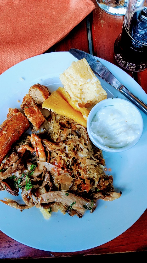 There was mamaliga which is Romanian polenta served with perfectly sauteed cabbage, sausage with grilled mushrooms, a pasta dish with vegan meatballs and even a burger. We went with the sausage and mushrooms, mamaliga and cabbage. And then more mamaliga and cabbage.