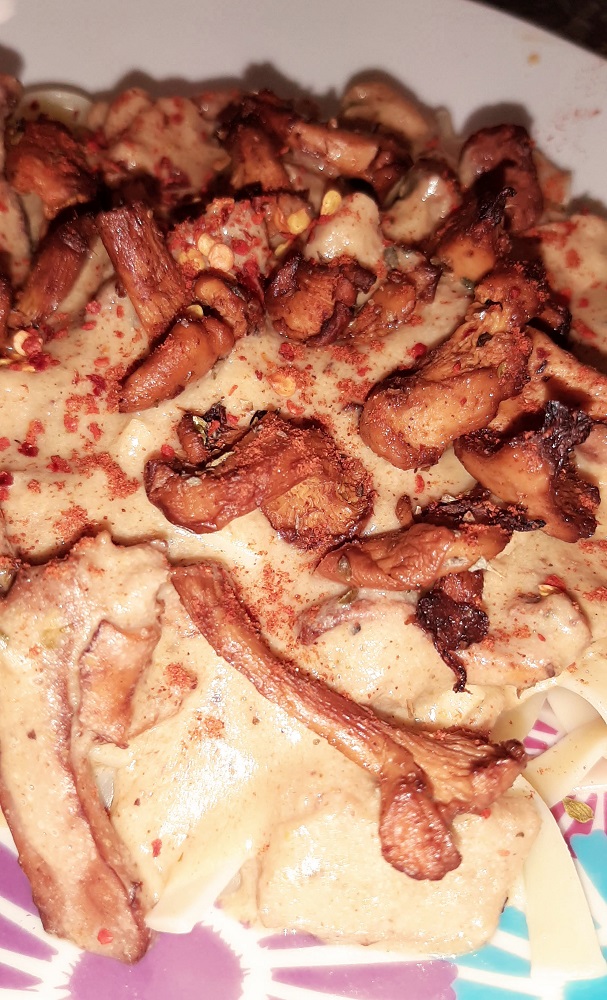 Add mushrooms, tagliatelle pasta and TVP to the skillet and toss well until everything is coated and fragrant and beautiful.
