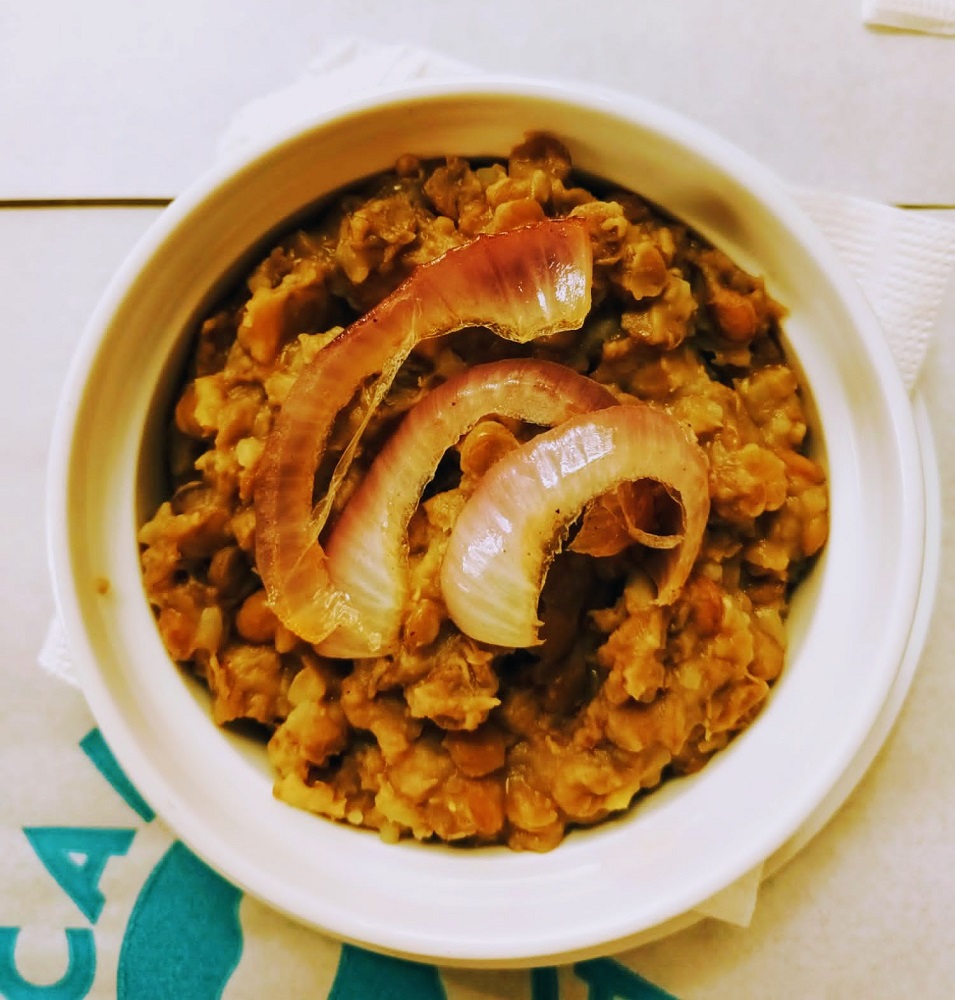 Finally, we had the pureed lentils and rice with grilled onions. This was probably my favorite dish of all. It tasted exactly like my southern granny’s beans & rice even though it was lentils. It didn’t need anything, except for maybe a bigger bowl. 🙂