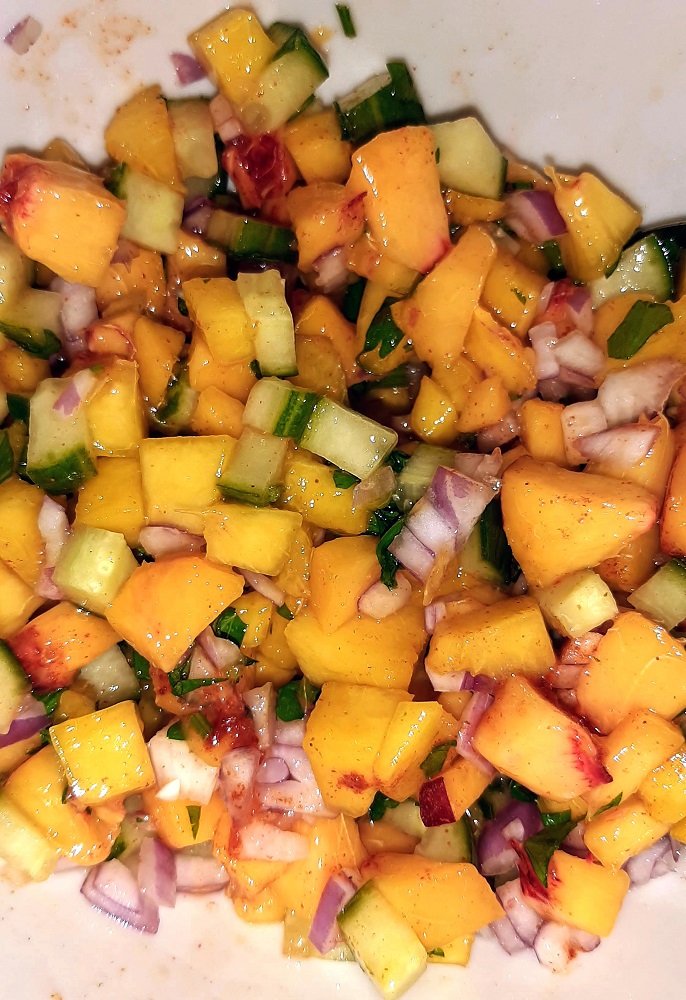 It’s always been a hate-hate relationship with non-tomato salsa because I just don’t find the combination of peaches or nectarines with cucumbers all that pleasant to my taste buds. Today I decided to do it again just to see if my mind or my palate has changed.