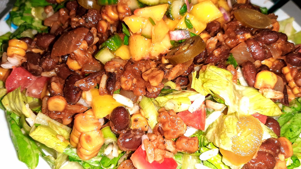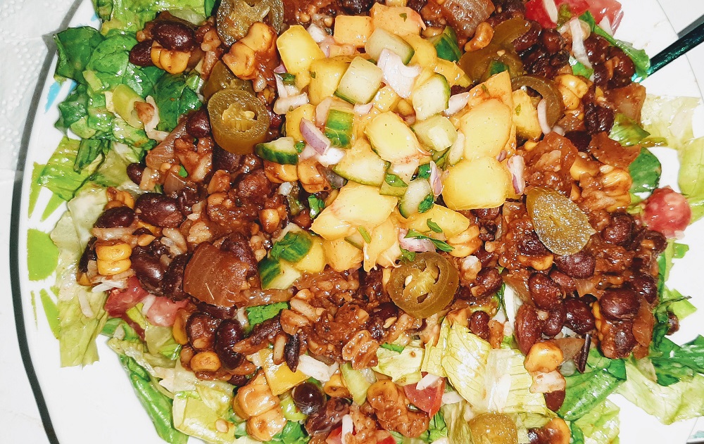 Today’s vegan taco salad is similar to dozens of vegan salad recipes I’ve made over the years but the difference is that I jumped out of my comfort zone and made something that I have yet to have a good experience with: peach & cucumber salsa.