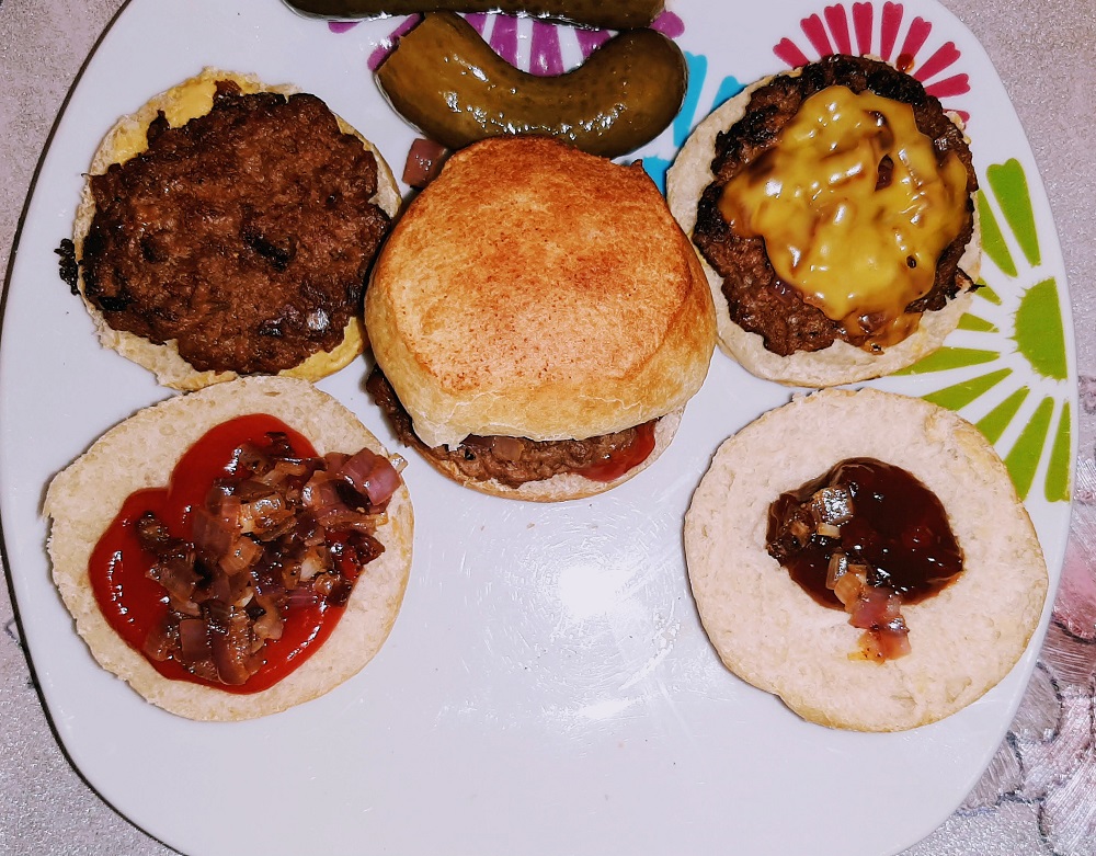 Cook burgers in the same skillet until brown and warm.