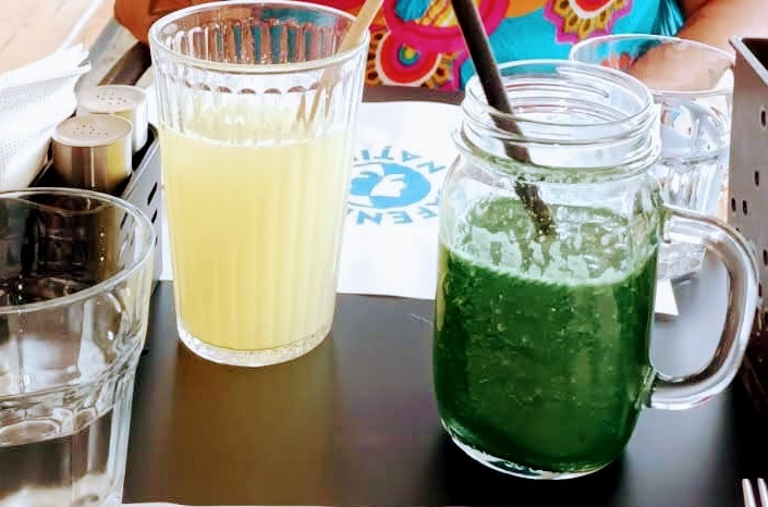 To start we tried something other than beer and water. I chose a ginger lemonade with fresh ginger which was very delicious and refreshing, which was much appreciated on one of the last days of this European heatwave. He ordered a green smoothie that came with kale and apple and carrot and a bunch of other stuff that was…okay for me but he loved it.
