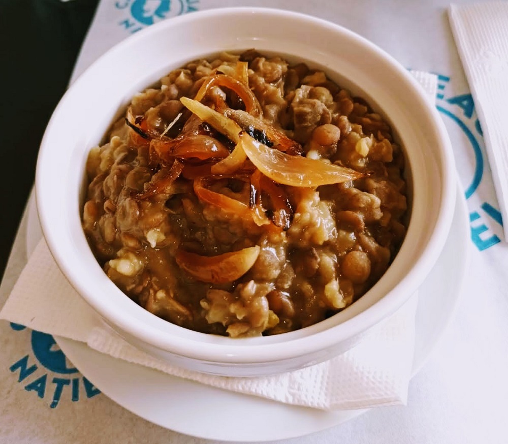 This time around we chose a few different dishes and one that’s already become an old faithful dish, the pureed lentils and rice dish with caramelized onions served on top.