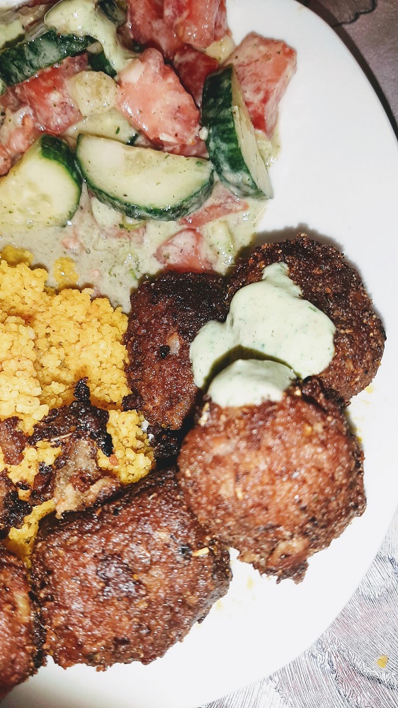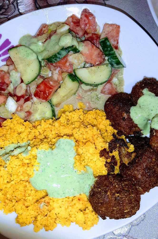 Step Seven: Toss salad in dressing and drizzle the remaining dressing over the couscous and chiftele (optional).