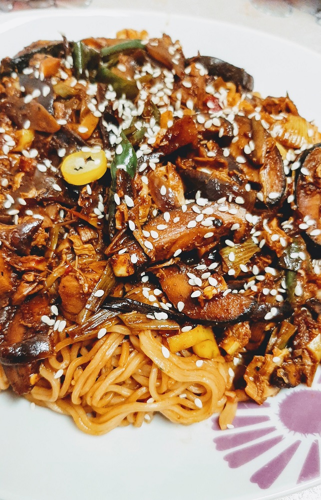 So there are noodles but there are also banana blossoms. Don’t judge because I know what you’re thinking, here we go with another of those specialty ingredients that are impossible for normal vegans to find. I would have said the same thing, except I was just browsing the Asian section of Kaufland and happened up these canned banana blossoms in water. Of course I grabbed them, because all these vegan chefs have been making everything out of it from vegan fish to vegan chicken and I was curious to try it out.