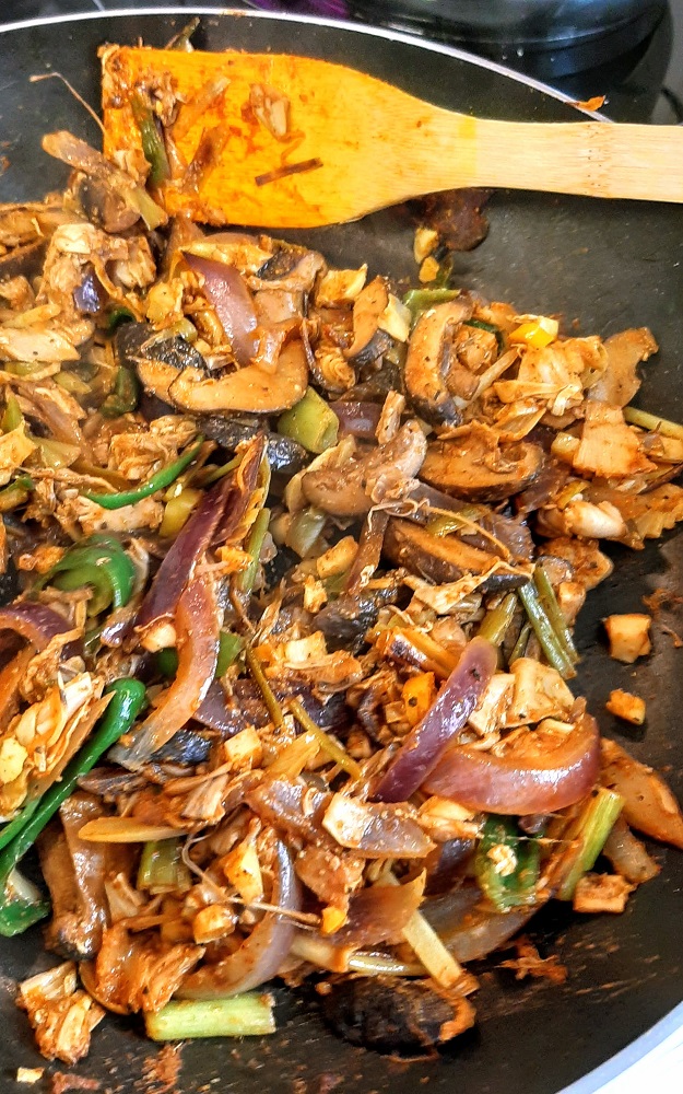 -Cook shrooms until they start to brown on the edges. Add in onion and banana blossoms. Cook 5 minutes.