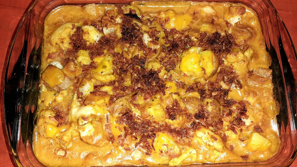 Bake on 220C for 15 minutes. Add crispy fried onions (or breadcrumbs) on top and bake another 5 minutes.