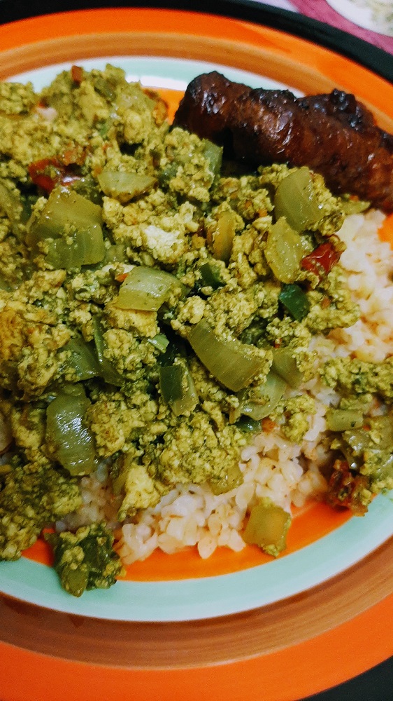 Cook tofu over medium-high heat, stirring frequently so it doesn’t stick. About 10 minutes in, add the onion & peppers and keep stirring until you get the vegan egg consistency you prefer. Because of the extra water, I cooked mine for about 15 minutes total.
