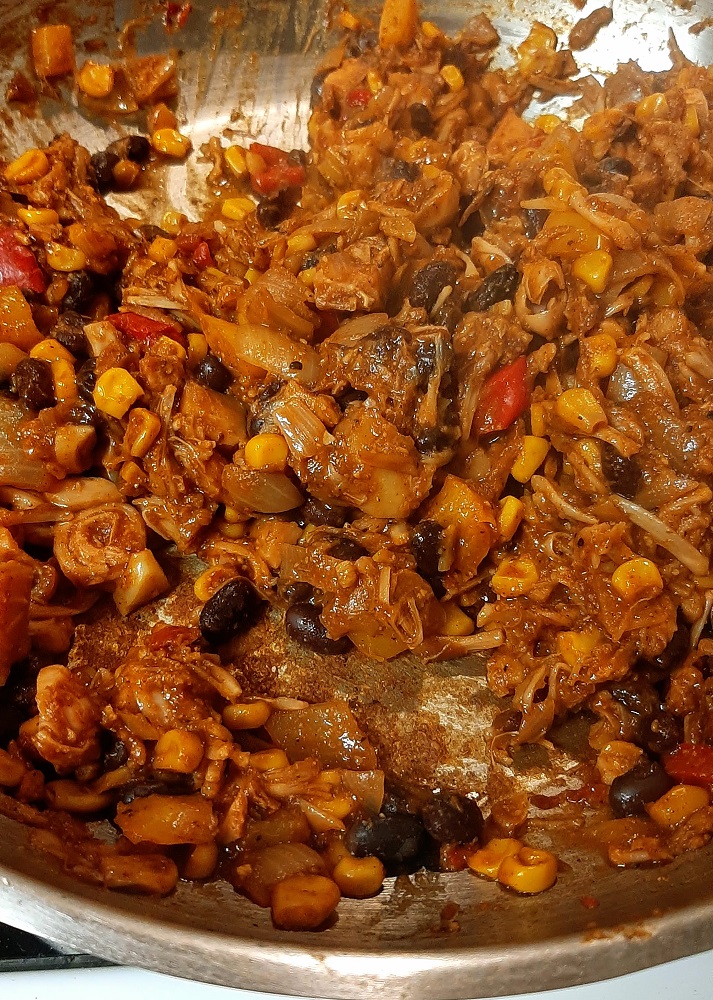 *Add black beans and jackfruit, plus more seasoning. I like to add a tablespoon of tomato paste for extra flavor and add water or broth to create a thick sauce.