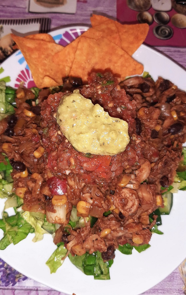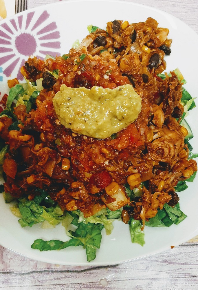 *Shred/separate the jackfruit and season it with salt, black pepper, cayenne pepper, cumin, oregano and smoky paprika. Set aside.