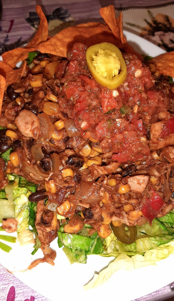 I decided to start simple with a nacho bowl. It turned out delicious and flavorful, and I’m thinking I’ll try it again as some kind of shredded barbecue sandwiches.