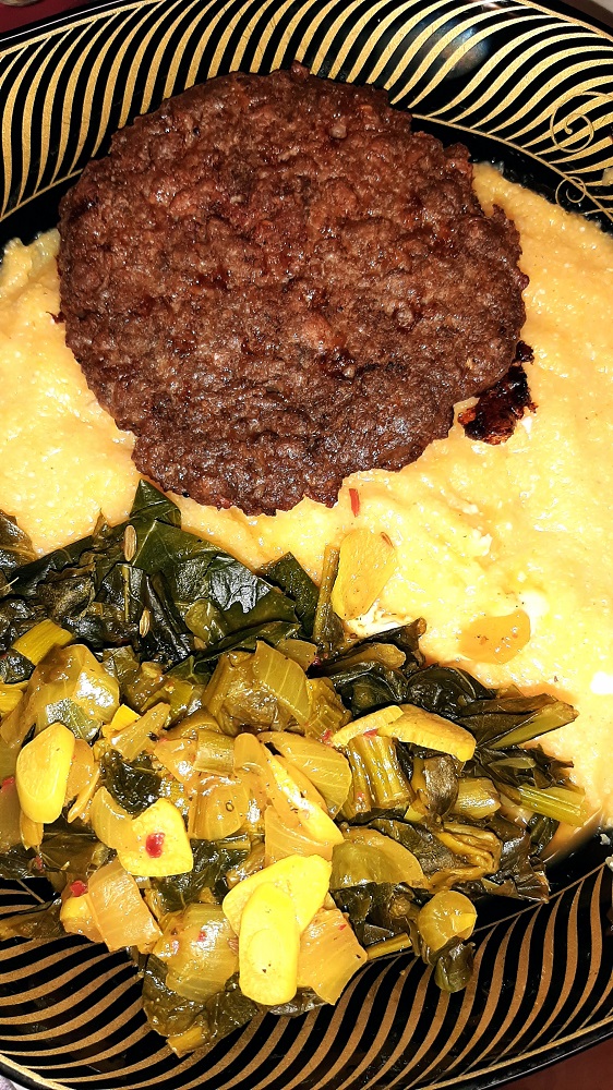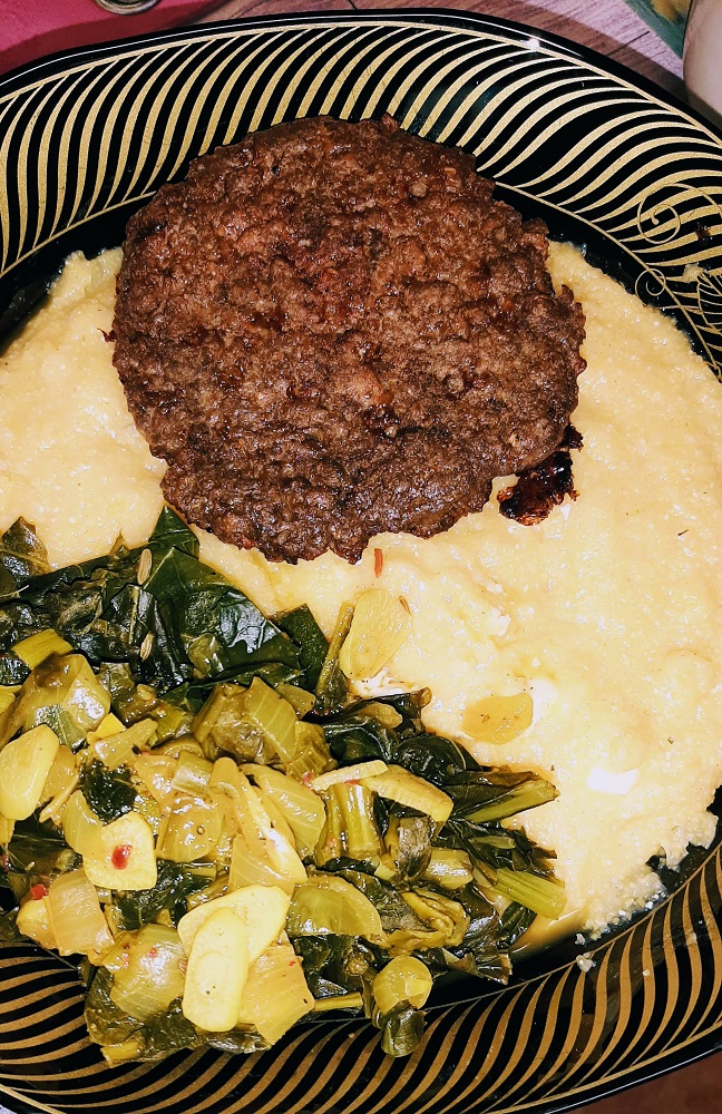 I paired this polenta with a Beyond “steak” patty and kohlrabi greens with garlic and grilled onions because, well because it is wicked delicious.