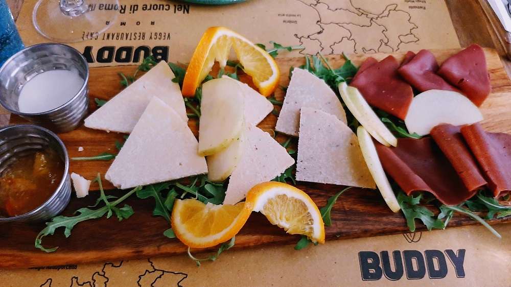 Back to Buddy! We rewarded ourselves after such a long day with a nice sorta romantic dinner that started with a bottle of vegan chianti and a vegan cheese board which was absolutely out of this world! The vegan bresaola was unbelievable but the stars of the board were the three different cheeses. They were hard cheese wedges with different flavor profiles–salty, spicy and sweet–that went well with apple slices, apricot preserves and orange slices, all on a bed of arugula.