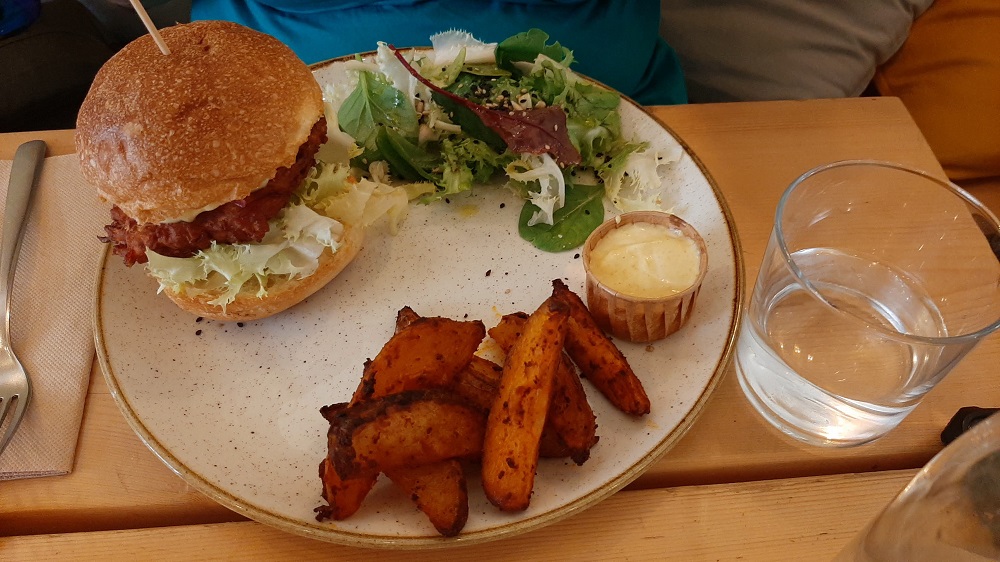 For lunch we ordered polenta fries which were delicious and not at all as greasy as I thought they would be with a homemade vegan mayo and a curry dipping sauce. He ordered buckwheat noodles with vegetables and sesame oil while I opted for a Pakora burger which was fantastic with pickled red onions and a curry sauce similar to what was used on the polenta fries.