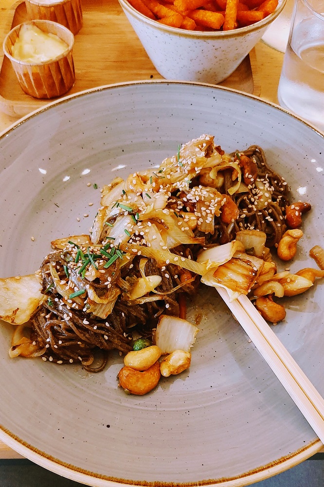 For lunch we ordered polenta fries which were delicious and not at all as greasy as I thought they would be with a homemade vegan mayo and a curry dipping sauce. He ordered buckwheat noodles with vegetables and sesame oil while I opted for a Pakora burger which was fantastic with pickled red onions and a curry sauce similar to what was used on the polenta fries.