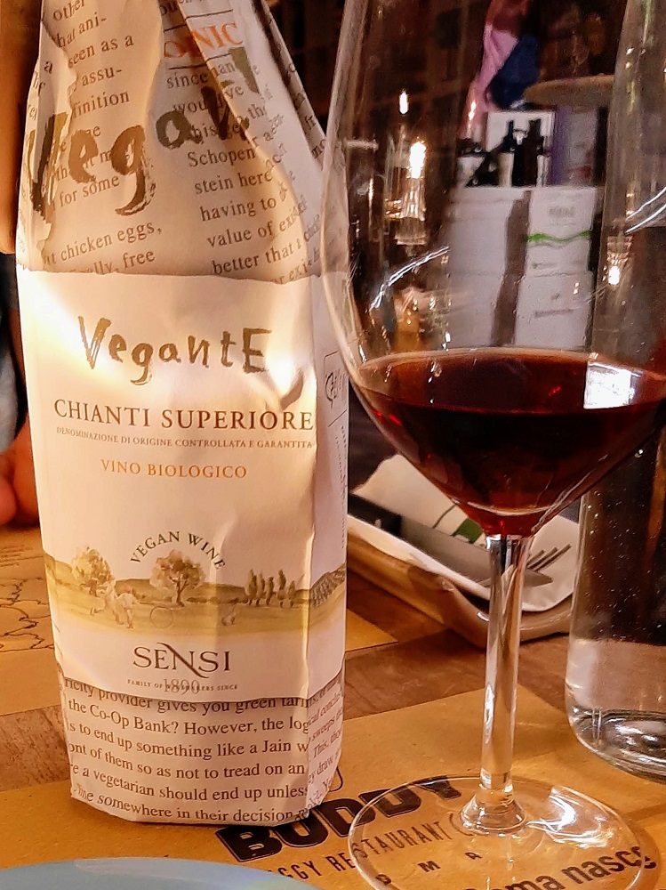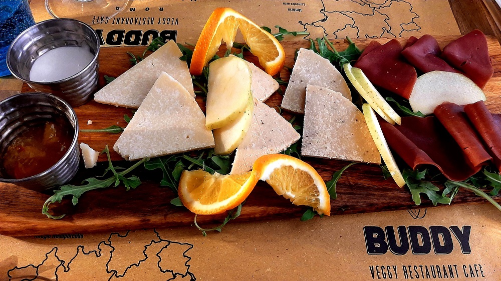 Back to Buddy! We rewarded ourselves after such a long day with a nice sorta romantic dinner that started with a bottle of vegan chianti and a vegan cheese board which was absolutely out of this world! The vegan bresaola was unbelievable but the stars of the board were the three different cheeses. They were hard cheese wedges with different flavor profiles–salty, spicy and sweet–that went well with apple slices, apricot preserves and orange slices, all on a bed of arugula.