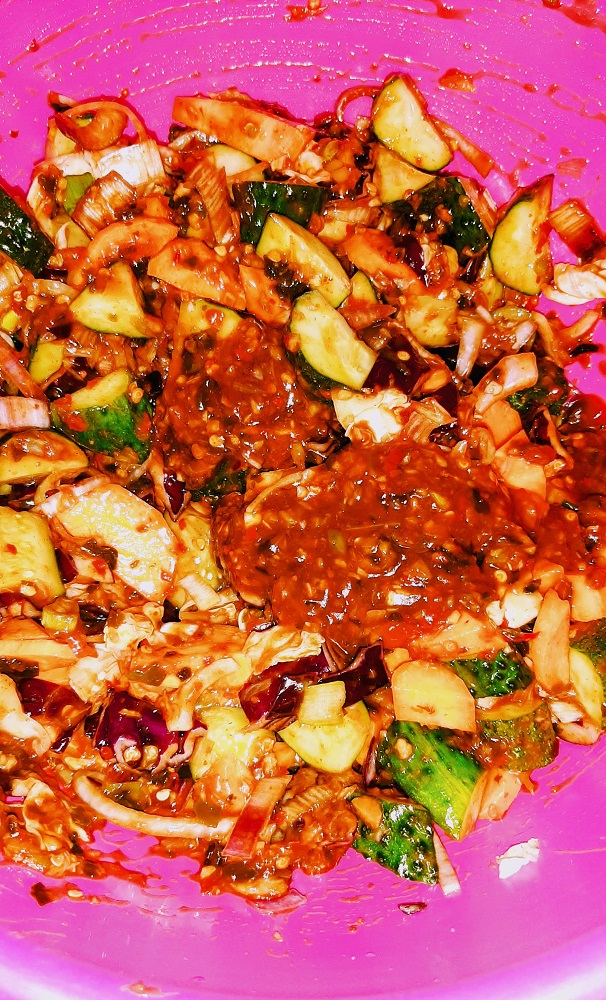 For the gochujang/gochugaru: I’m going to plan an order for more online but in the meantime I used regular chili flakes, a lot of them, about 50 grams and a different chili pepper paste with ground or grated ginger and lemongrass added.