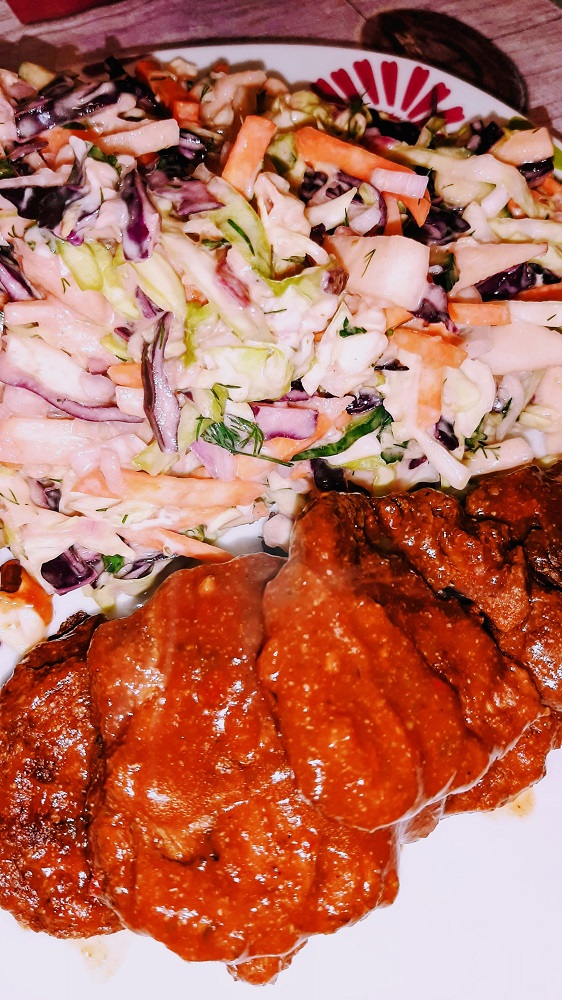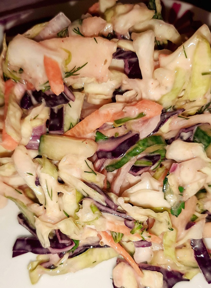 Mixed cabbage salad is (sort of) a creation of my own mind. I love to eat a nice vegan salad for lunch but for the past few months it’s been hit or miss to find Romaine or Bibb lettuce, or most lettuce that’s not iceberg. So I grabbed a different type of ‘leafy green’ in the form of cabbage.