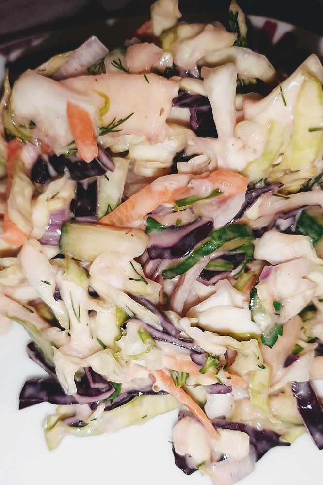 Mixed cabbage salad is (sort of) a creation of my own mind. I love to eat a nice vegan salad for lunch but for the past few months it’s been hit or miss to find Romaine or Bibb lettuce, or most lettuce that’s not iceberg. So I grabbed a different type of ‘leafy green’ in the form of cabbage.