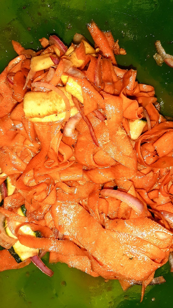 *Cut carrots, zucchini & squash into thin ribbons and place in mixing bowl.