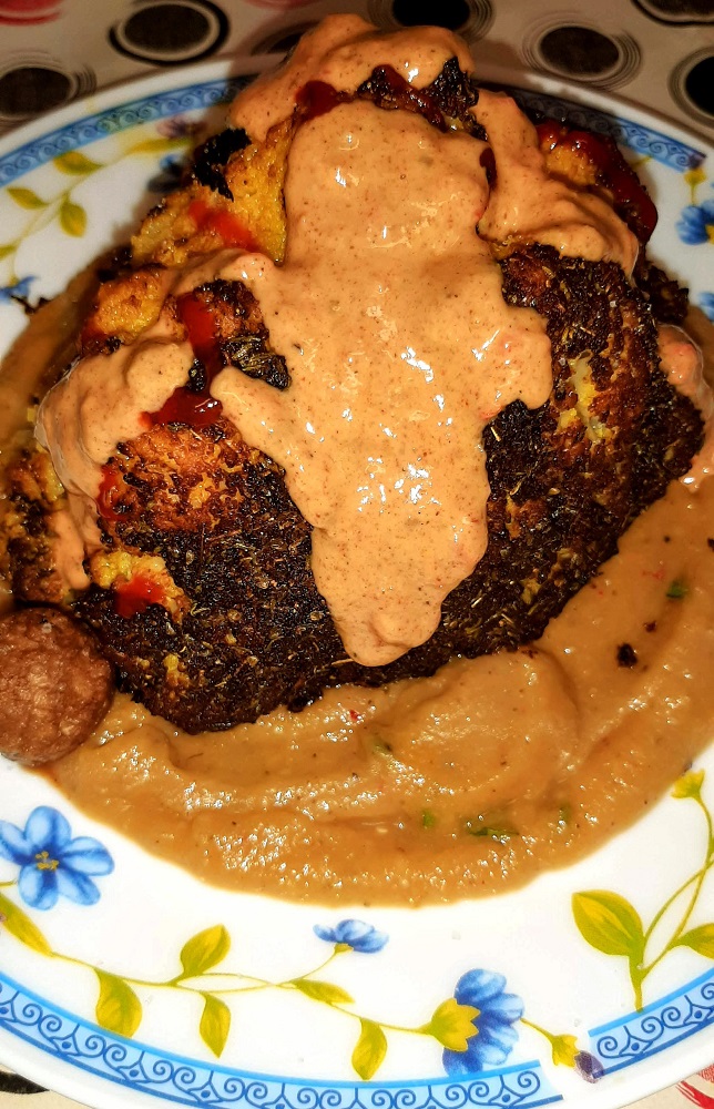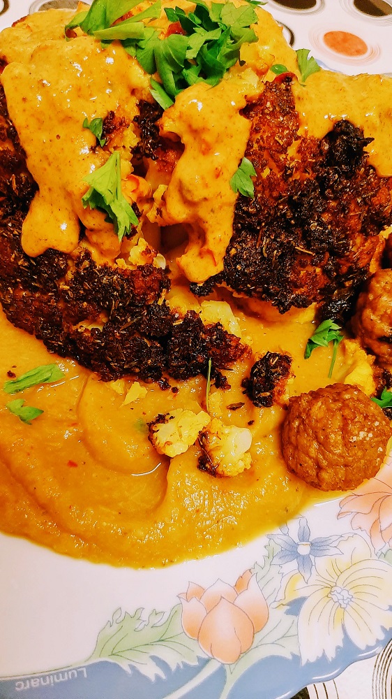 Serving suggestion: I served the cauliflower on garlic roasted baba ghanoush with a few vegan meatballs, but you can serve with rice or potatoes, or anything your little heart desires.